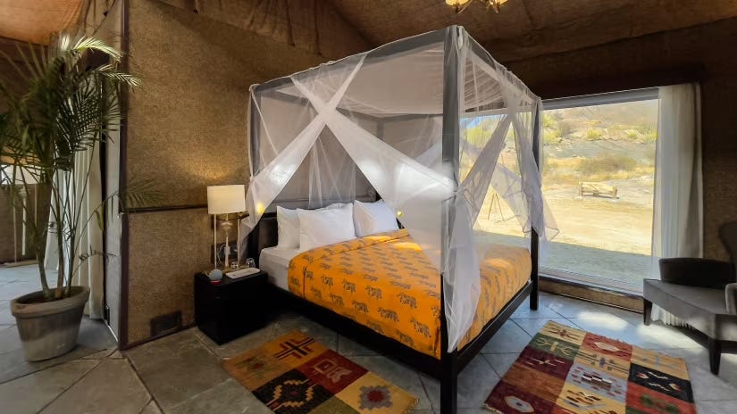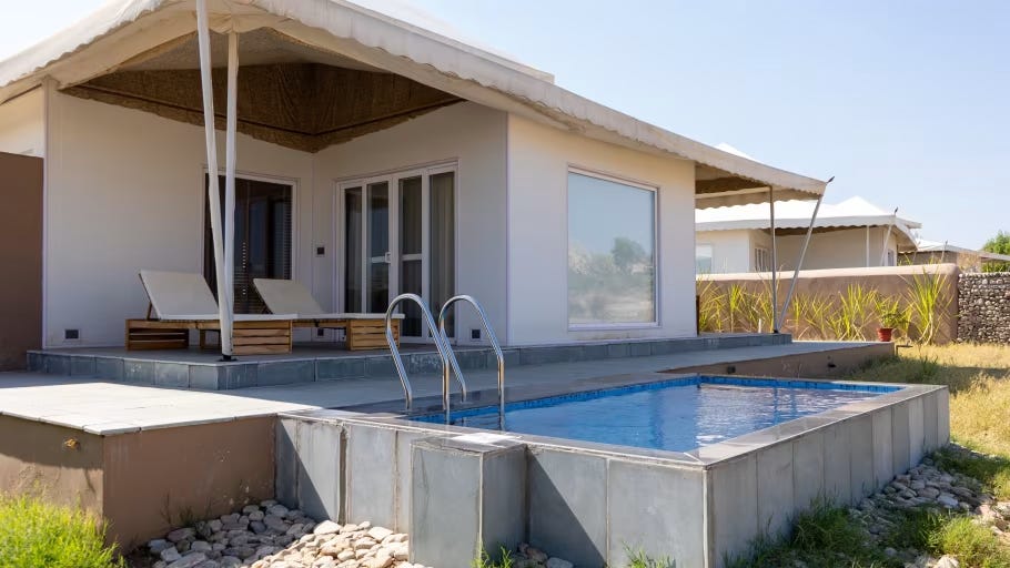 The expansive Luxury Tents in Jawai offer a luxurious space amidst the wilderness, evoking the feeling of a private residence amid the jungle. Every detail, from the décor to the bed linens, is inspired by wildlife, enhancing the overall experience. These regal tents, complete with a plunge pool, provide a serene retreat for you.