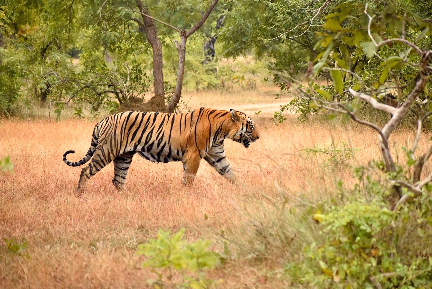 Spring in Ranthambore unfolds quietly around you: golden grasses sway, langurs call from ancient banyan trees, and somewhere in the forest, a tiger slips silently through the shadows.